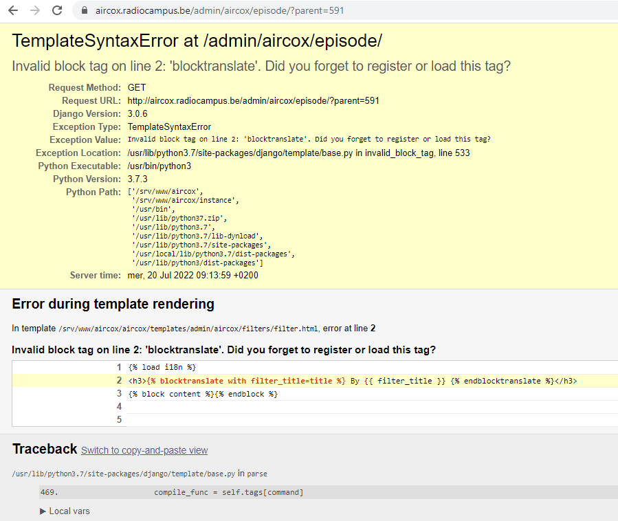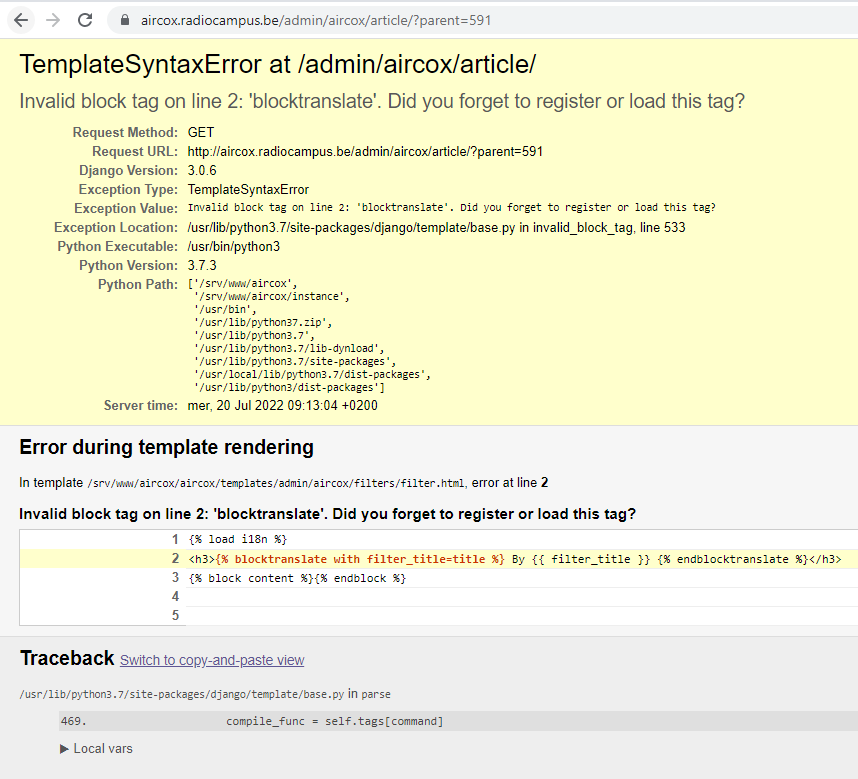 Le problème vient d'un changement de nom pour les template tags entre les différentes version de Django 4.1;