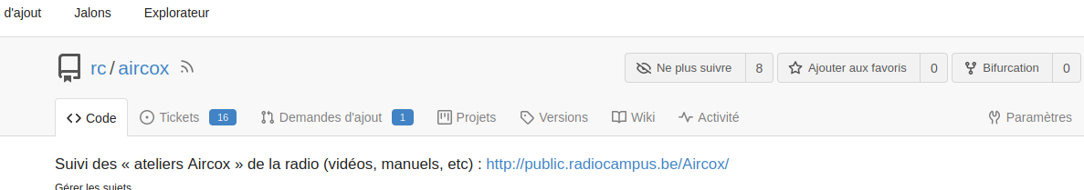 Attention que le dépôt aircox est un dépôt publique, indexable par Internet puisque Aircox est développé en tant que logiciel libre et copyleft.